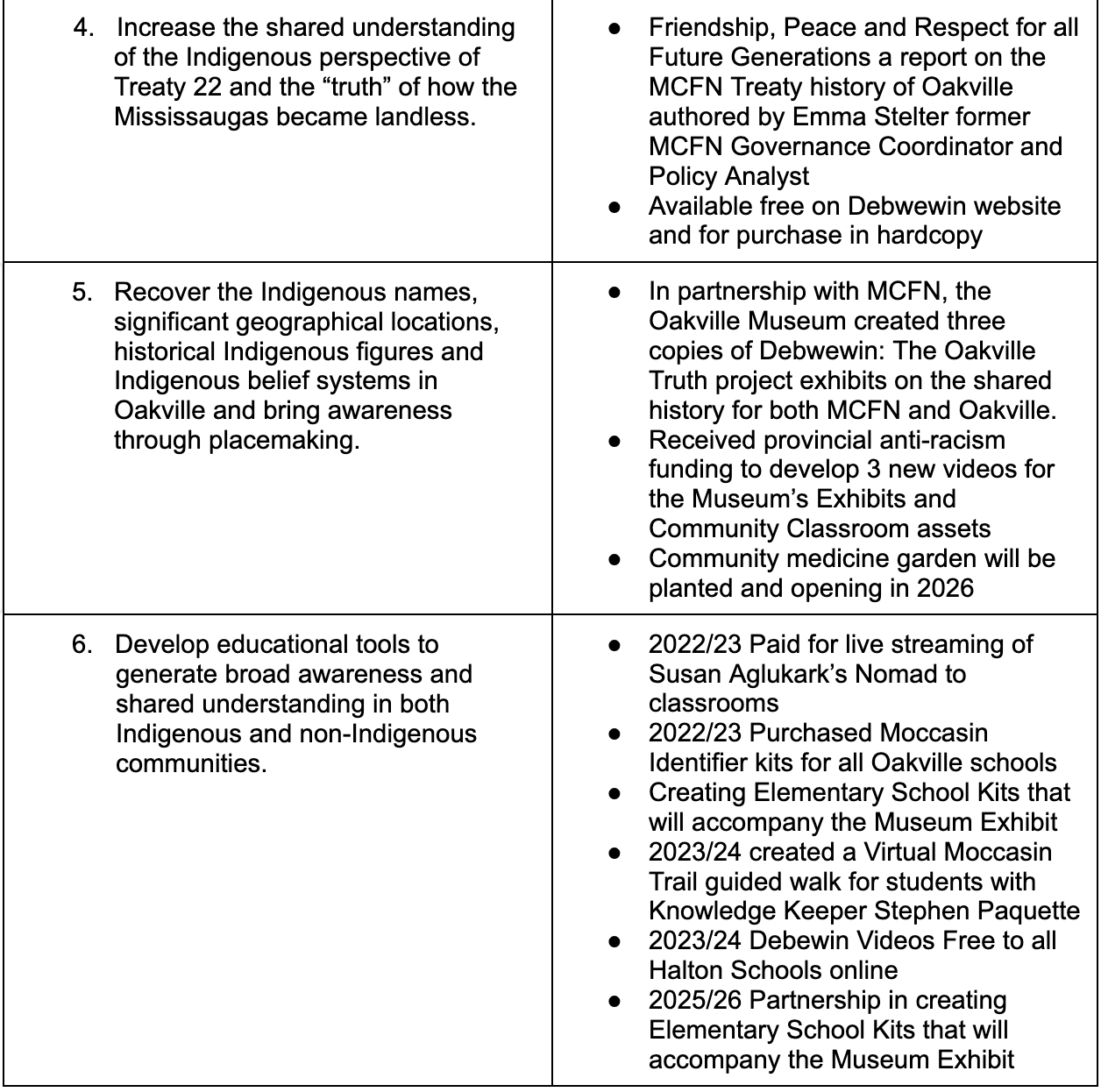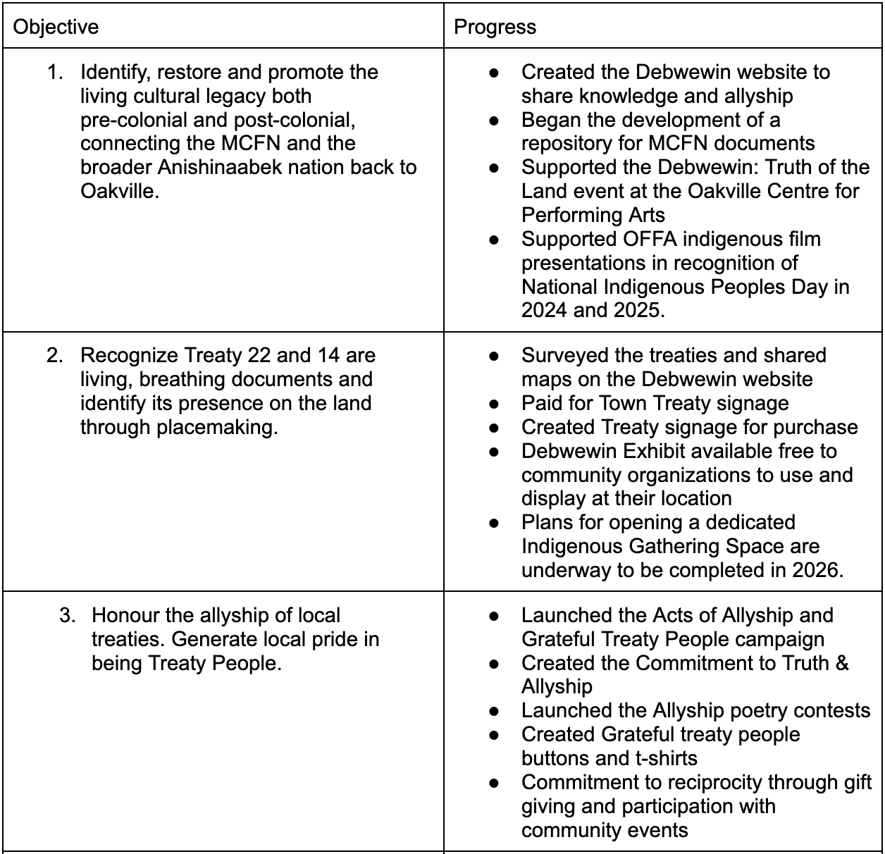 Led by MCFN Elder and Indigenous Advisor Peter Schuler, it had an Advisory Council guiding the project to foster a deeper understanding of the local history of the Indigenous people in Oakville from an Anishinaabek perspective. In 2022, The Ally Leadership Council was launched to support community-to-community reconciliation. The Debwewin Project has a number of main long-term objectives and continues to work with Mississauga’s of the Credit First Nations, and local organizations to achieve these objectives. The progress has been shared in the table below: